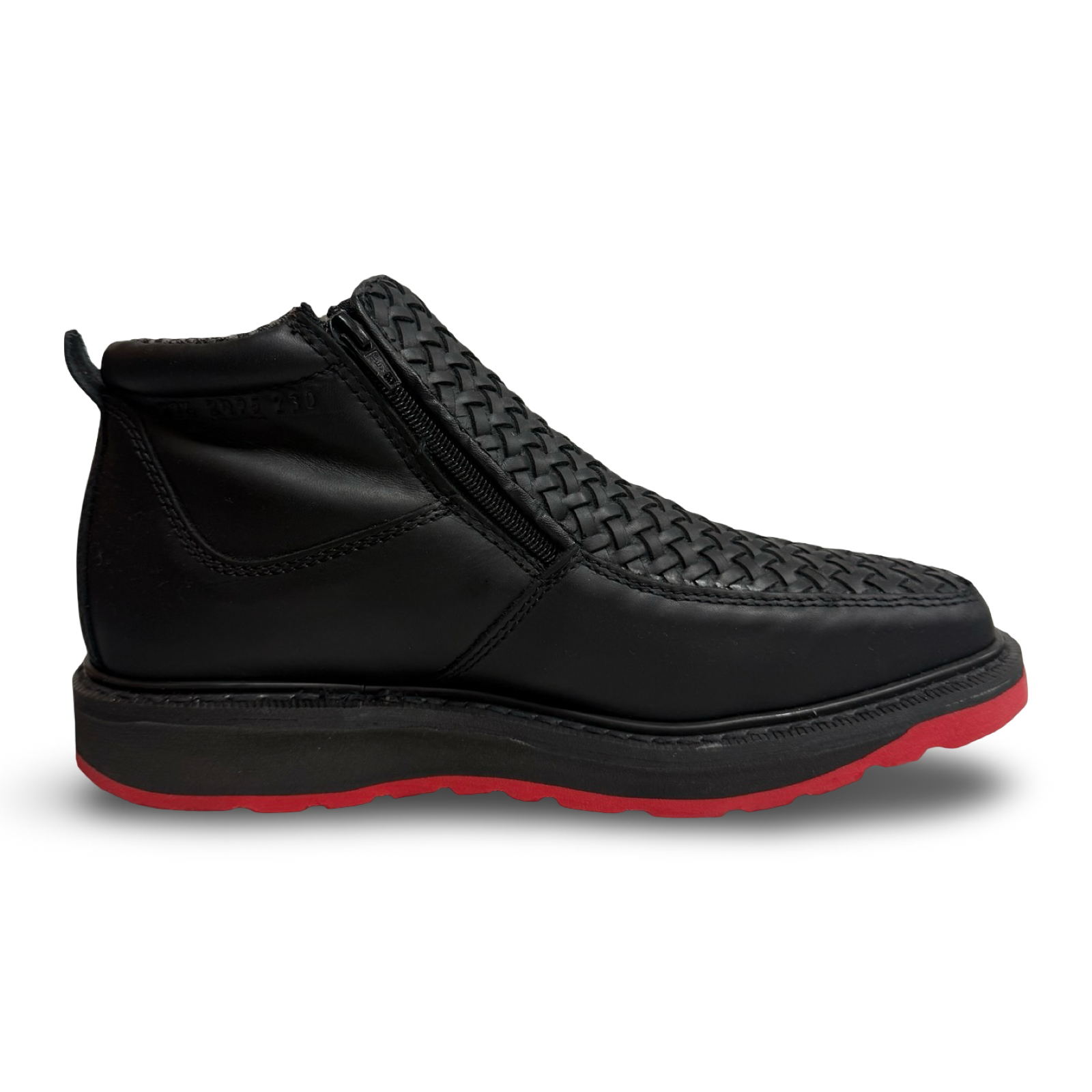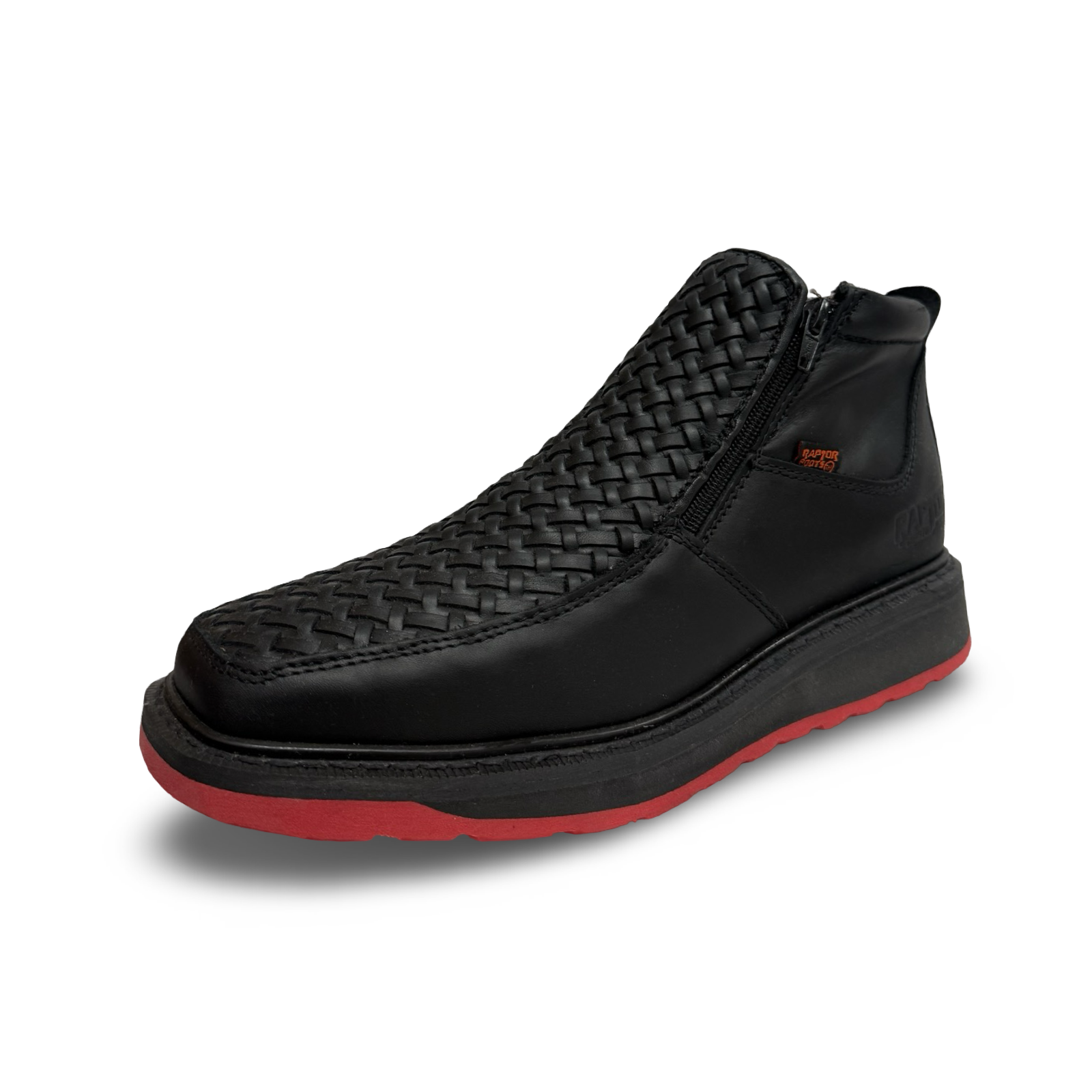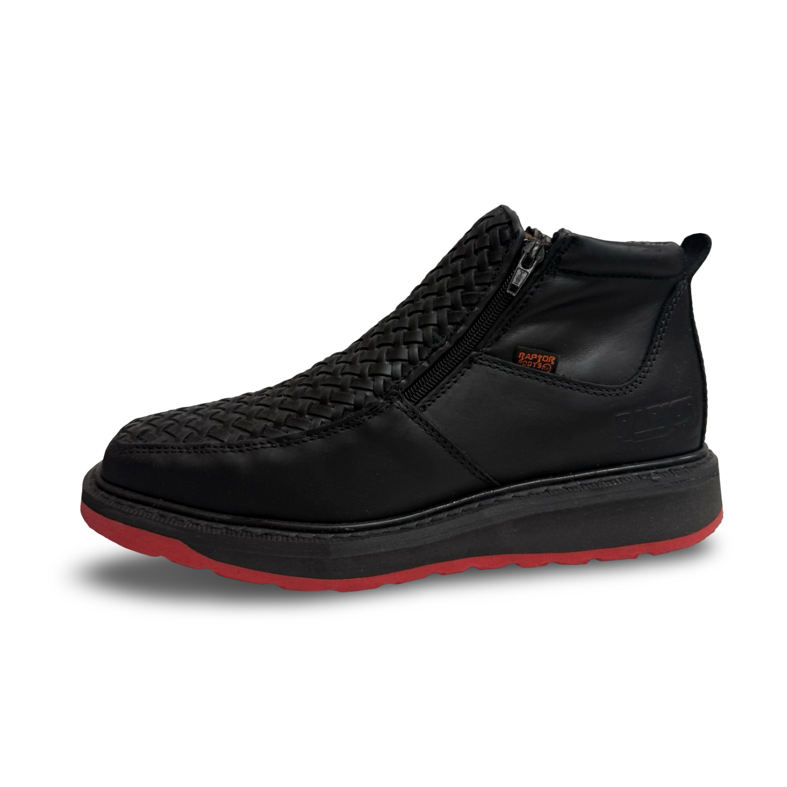 Crafted from premium black woven leather, these Raptor shoes feature a bold red outsole that delivers both style and performance. Designed for all-day comfort, they offer a soft, supportive fit and an anti-slip sole that provides secure traction on every step. Perfect for those who want durability, comfort, and standout design in one pair.